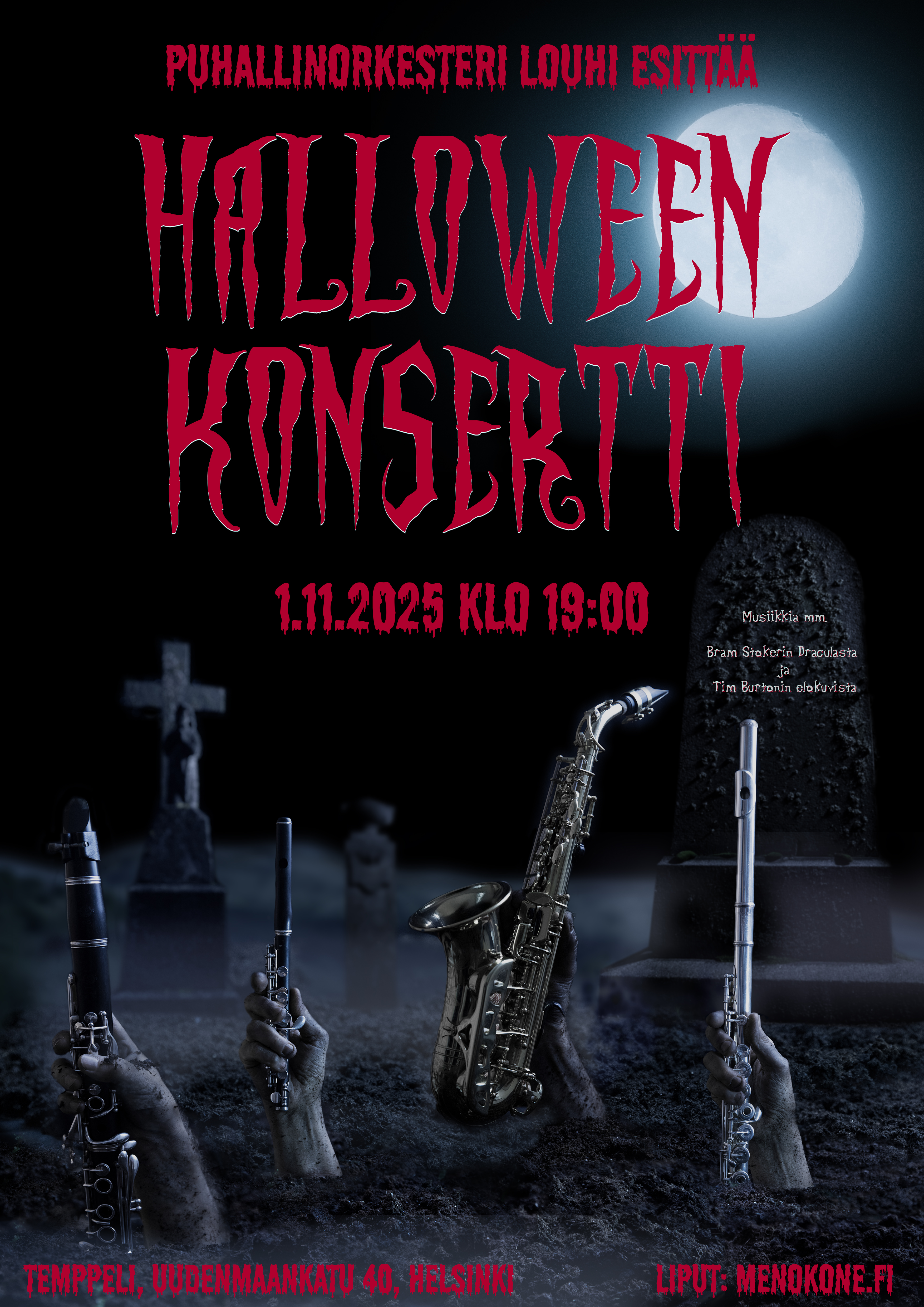 TERVETULOA puhallinorkesteri Louhen Halloween -konserttiin 1.11.2025 klo 19! Konserttipaikka on Temppeli/Templet, Uudenmaankatu 40, Helsinki. Liput 19€. Yhteistyökumppanimme on Happy Guide Helsinki, joka järjestää maksullisen Kauhujen kävely -kierroksen Helsingin aavemaisimpiin paikkoihin ennen konserttia klo 17-18.30. Liput ja lisätiedot osoitteesta Menokone.fi ja Louhen Facebook-sivu.