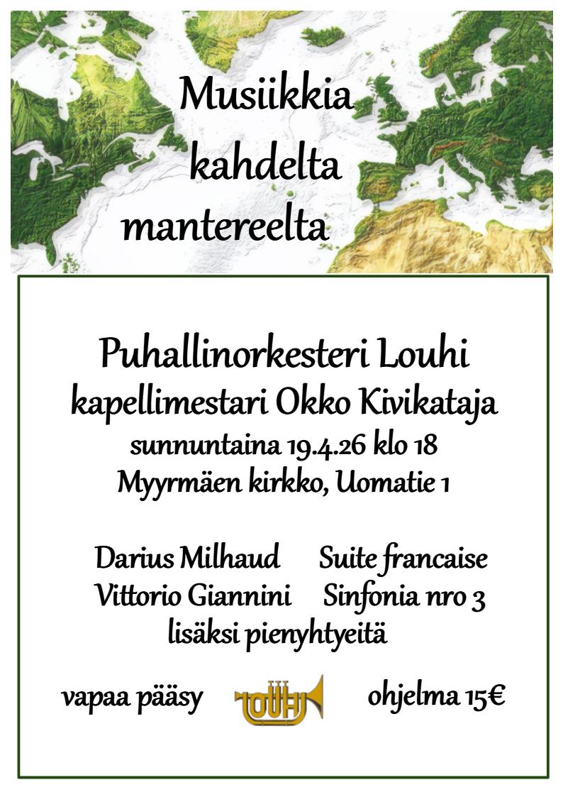 Tule valoisana kevätiltana kuuntelemaan sinfonista puhallinmusiikkia Myyrmäen kirkkoon! Puhallinorkesteri Louhen ohjelmassa ovat Vittorio Gianninin ja Darius Milhaudin isot teokset. Lisäksi konsertissa esiintyvät orkesterin vaskiyhtye ja kaksi klarinettiyhtyettä.